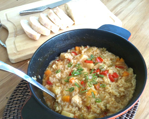 Add the chicken and rice, cover and transfer to oven for 1 hour.