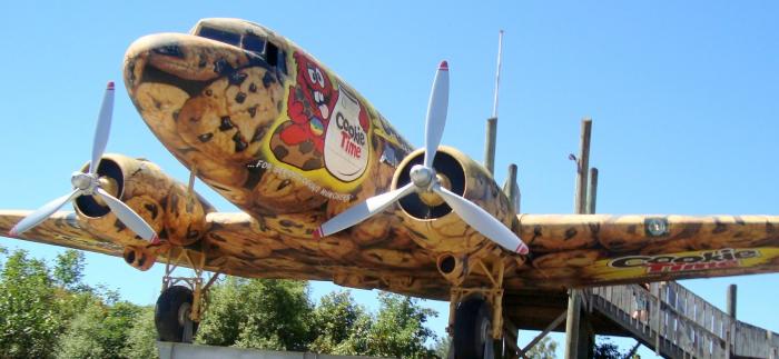 A frontal view of the famous ""Cookie Time '' plane, on the display , main highway- Mangaweka, New Zealand.