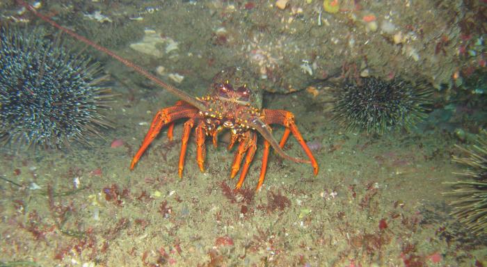 A crayfish hanging out with kina. This photo was taken on a scuba dive trip in Milford Sound.