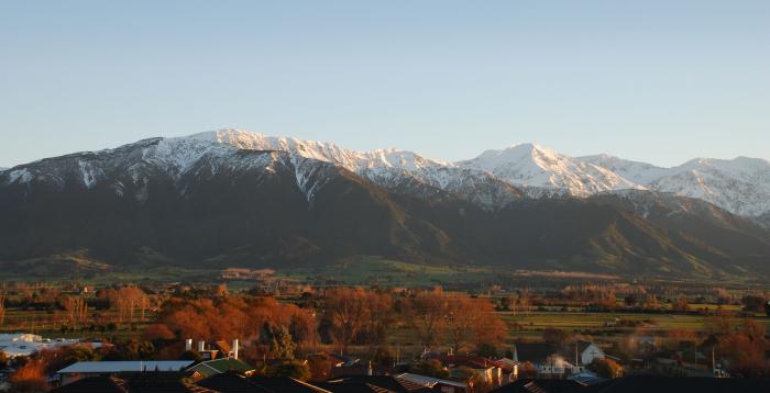 The early morning sun casts a beautiful golden hue over the township of Kaikoura. Mount Fyffe is the peak on the left of the photo.