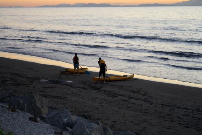 Two boys and their dog, with their kayaks on Paekakariki Beach, Kapiti Coast