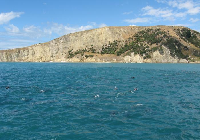 Off the coast of Kaikoura this huge pod of dusky dolphins is spotted. Read my review of Dolphin Encounter.