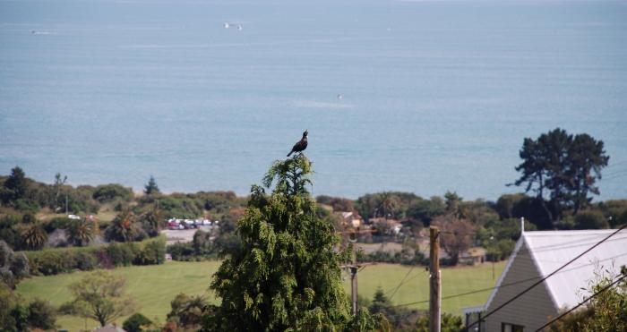 A tui is photographed mid song in Nelson. The tui has a wonderful range of noises and songs – they can whistle, click, chuckle, gurgle and trill. The tui was named ‘parson’s bird’ by early European settler’s in New Zealand because the white feathers on the tui’s throat reminded them of the parson’s collar. Tahunanui beach is in the background.