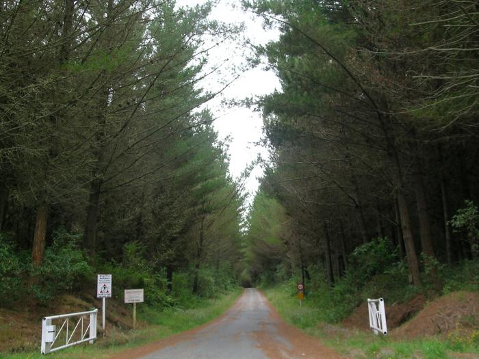Entrance for logging trucks in one of New Zealand's largest forests, out of Tokoroa.