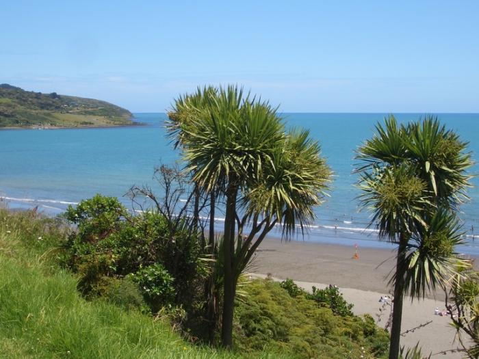 cabbage trees with the ocean in view - so KIWI. Awesomw. I am using this image in a desk calendar.
