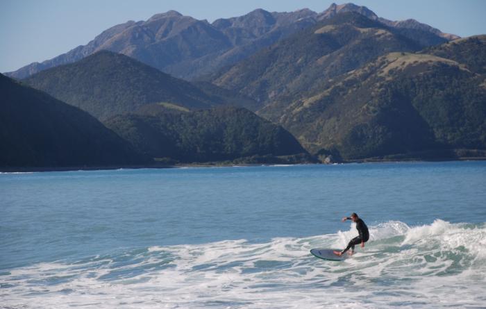 A surfer rides a wave at Mangamaunu, Kaikoura.