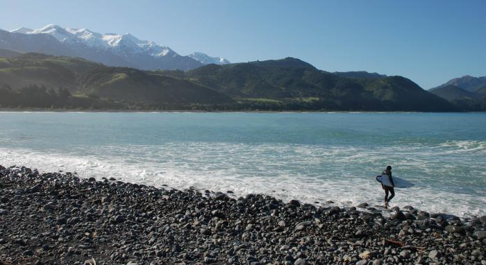 A surfer heads out at Mangamaunu, Kaikoura. This photo was taken at the end of September...with all that snow still on the mountains it looks too cold for me!