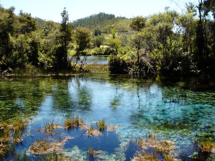 Another shot of Te Waikoropupu Springs in Golden Bay. The floor of the lake is covered with white sand. Waters expelled from some of the smaller vents carry the sand upward. These vents are known as the 'dancing sands'.