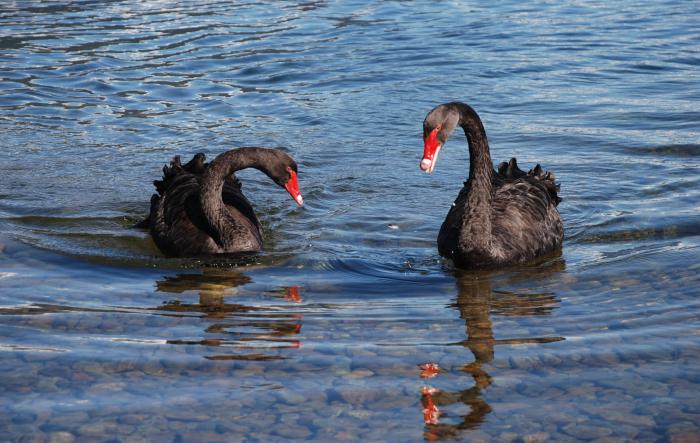 Two black swans feeding at Lake Rotoiti, Nelson Lakes, New Zealand. Please check out the rest of my photos in this "black swan" series. The black swan has a bugle-like call, and hisses to defend its nest.